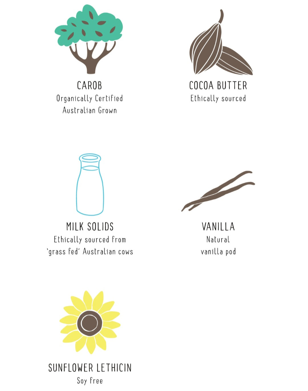 Made with natural ingredients: Milk solids, cocoa butter, organically grown carob powder (24%), natural vanilla extract, emulsifier (GMO-free sunflower lecithin).